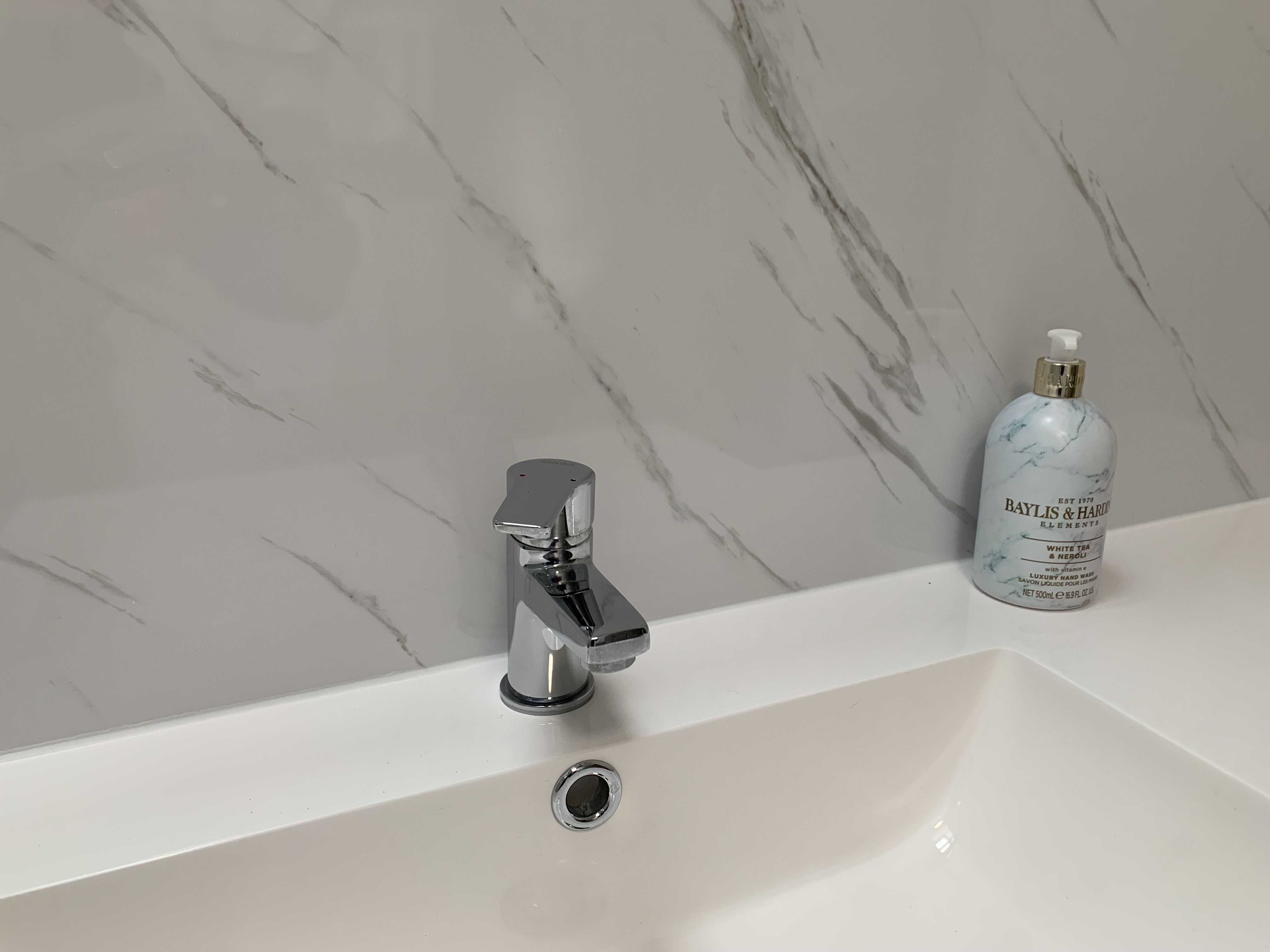 Luxuriously appointed bathroom with dual power showers, heated towel rails and plentiful towels. Sink, toilet.